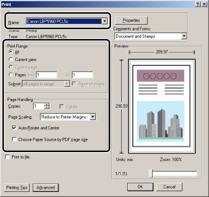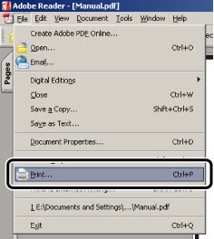 This section describes the procedure for specifying the paper size or page setup when printing from an application, taking Adobe Reader 7.0 as an example.