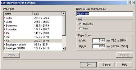 This dialog box allows you to specify the height and width of custom paper size, which is different from the standard paper sizes.