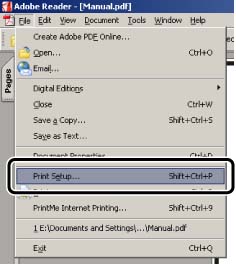 1. Open the PDF file to print with Adobe Reader, and then select [Print Setup] from the [File] menu.