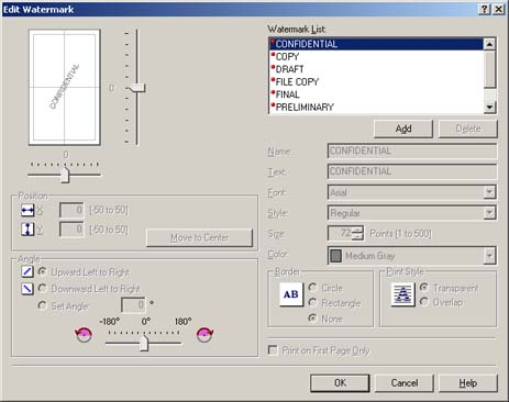 | [Border] | Specify whether a border encloses the watermark when printed. |