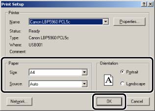 2. Specify the paper size of the document and the printing orientation, then click [OK].