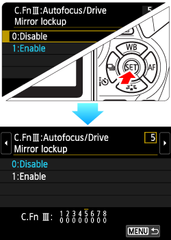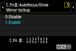 > key to select [C.Fn III: Autofocus/Drive - 5: Mirror lockup], then press <