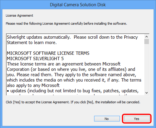 12. When using Digital Camera Solution Disk Ver.102.0 or later, the screen below will appear on computers connected to the internet. If you agree to the disclaimers, click [Yes].