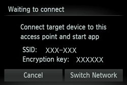 When you are in the vicinity of an access point that you have previously connected to, the camera will automatically connect to it. To change access points, select [Switch Network] from the screen that will be displayed when the connection is being established.