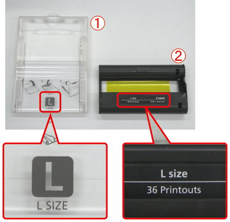 1. Check the sizes indicated on the [paper cassette] and the [ink cassette].