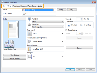 Sending a secure print job1. Click any of [Basic Settings], [Page Setup], [Finishing], [Paper Source], [Quality] at the printer driver screen.