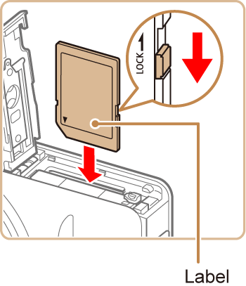 Insert the memory card facing as shown until it clicks into the locked position. Make sure the memory card is facing the right way when you insert it. Inserting memory cards facing the wrong way may damage the camera.