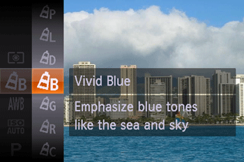 Vivid Blue | Emphasizes blues in images. Makes the sky, ocean, and other blue subjects more vivid. |