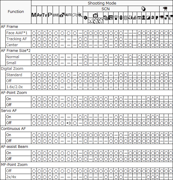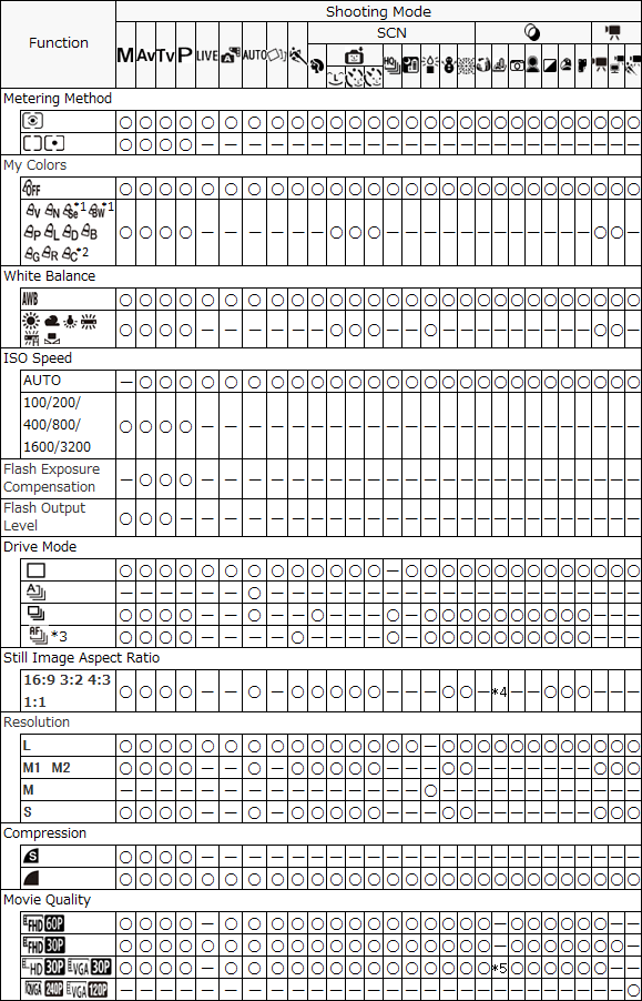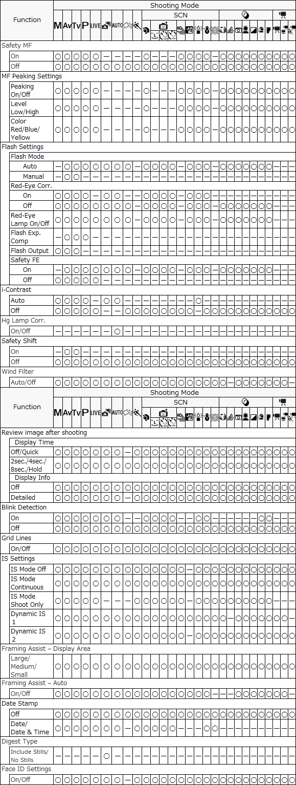 If you cannot set certain shooting functions, please check the current shooting mode of your camera. Some shooting functions may not be available in certain shooting modes. For details on the possible combinations of shooting functions and shooting modes, please refer to the following list.