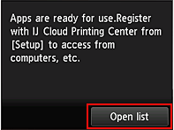 8. The screen below will be displayed, indicating that applications are ready for use. Press the right function button to select [ Open list ].