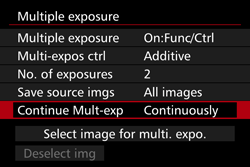 - With [Continuously], multiple-exposure shooting continues until the setting in steps 4- 5 is set to [Disable].