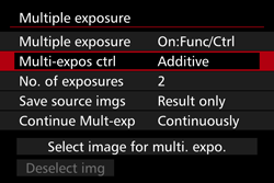 - If [On:Func/Ctrl] and [Additive] are both set, the image displayed during shooting may look noisy. However, when you finish shooting the set number of exposures, noise reduction will be applied and the final multiple-exposure image will be less noisy.