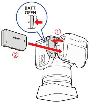 2. Slide the BATT. OPEN switch in the direction of the arrow and open the battery compartment cover (