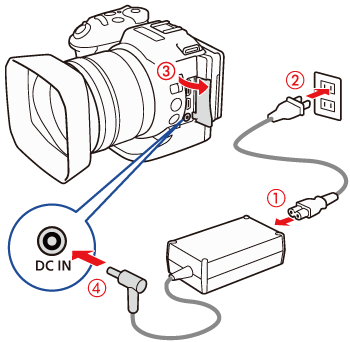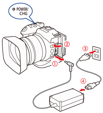 Turn off the camcorder before connecting or disconnecting the compact power adapter. After turning off the camcorder, important data is updated in the memory. Be sure to wait until the green power/charge indicator goes out.