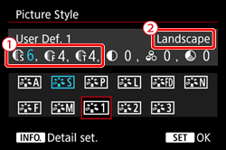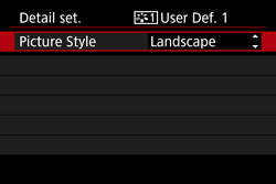 - If a Picture Style has already been registered under [User Def. *], changing the base Picture Style in step 6 will nullify the parameter settings of the registered Picture Style.