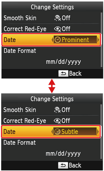 ] buttons to adjust the settings.Prominent: select the color of the date printed on the photo automatically