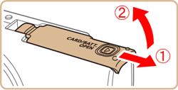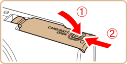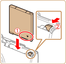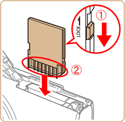 ) facing as shown until it clicks into place. - Make sure the memory card is facing the right way when you insert it. Inserting memory cards facing the wrong way may damage the camera.