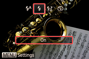 Press the [ ] button to access the flash setting screen, press the [ ] , [ ] buttons to select [ : On ], and the press the [ ] button.