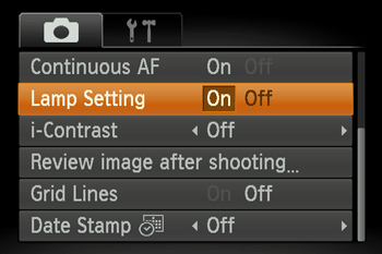 Press the [ ] button, choose [Lamp Setting] on the [Shooting] [ ] tab, and then choose [Off].
