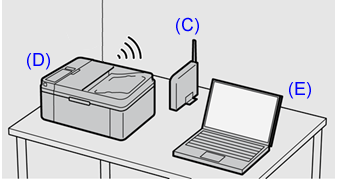 The wireless LAN router is "(C)". It is a repeater that connects a PC and a printer.