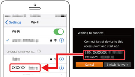 5. In the smartphone’s Wi-Fi setting menu, choose the SSID (network name) displayed on the camera to establish a connection. In the password field, enter the password displayed on the camera.