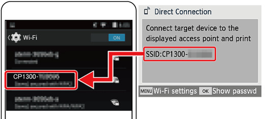 - Once you have set up SELPHY for a direct connection, an SSID is displayed in the lower right of the Home screen. To print after the first connection, select this SSID on your smartphone or camera.