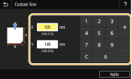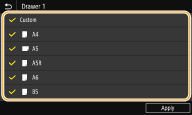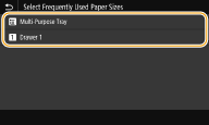 Setting to the registered custom sizeThe paper sizes that are registered in the procedure above can be called when <Custom> is selected on the paper size selection screen for the paper drawer or multi-purpose tray.