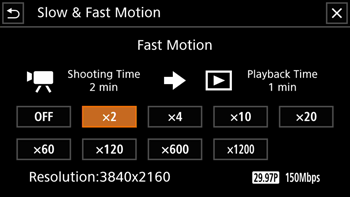 You can record clips that have a slow motion or fast motion effect during playback, simply by selecting the desired slow / fast motion rate. Available slow / fast motion rates will vary depending on the resolution and frame rate currently selected. Sound is not recorded when slow & fast motion recording is activated.